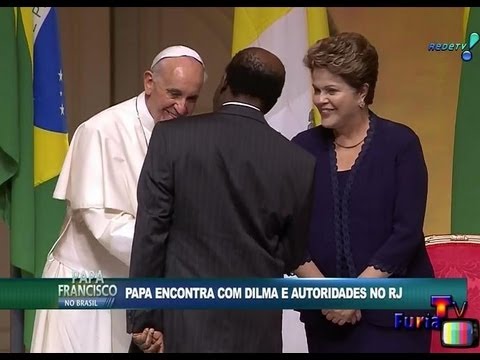 Dilma, sorridente, estava ao lado de Francisco. JB se aproxima e cumprimenta o papa.